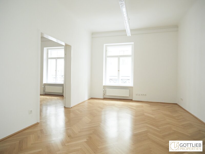 Zur sofortigen unbefristeten Vermietung gelangen zwei bzw. optional drei Bürozimmer in einem Büro zur gemeinschaftlichen Nutzung im Mezzanin eines repräsentativen Stilaltbaus in ausgezeichneter Lage der Wiener Innenstadt. Die sehr gut geschnittenen Räume mit einer Fläche von jeweils ca. 20,16 m² sind mit Klimaanlagen ausgestattet und separat begehbar sowie mit einer Verbindungstüre versehen. Ein weiteres Zimmer mit ca. 11 m² kann nach Vereinbarung dazugemietet werden. Die Gesamtfläche der Räumlichkeiten umfasst einen geräumigen Flur und Empfangsbereich, insgesamt sechs Bürozimmer, zwei Toiletten sowie eine Teeküche. Alle Zimmer sind getrennt begehbar.