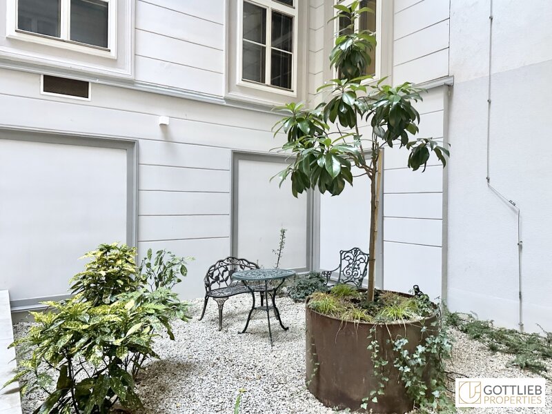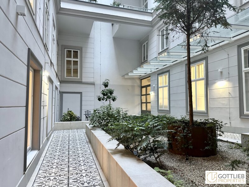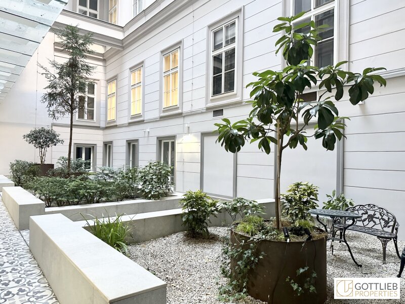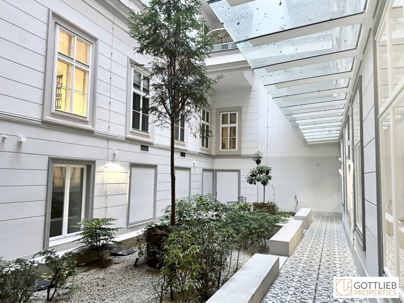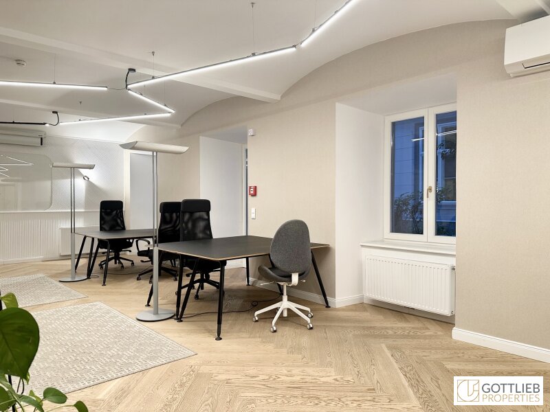 Das Büro befindet sich im Erdgeschoss in den ruhigen Innenhof gerichtet und beinhaltet zwei getrennt begehbare Bürozimmer inklusive Besprechungsraum, eine Küche, eine Toilette sowie eine kleine Terrasse. Der Innenhof ist direkt vom loftartigen Bürozimmer aus begehbar.