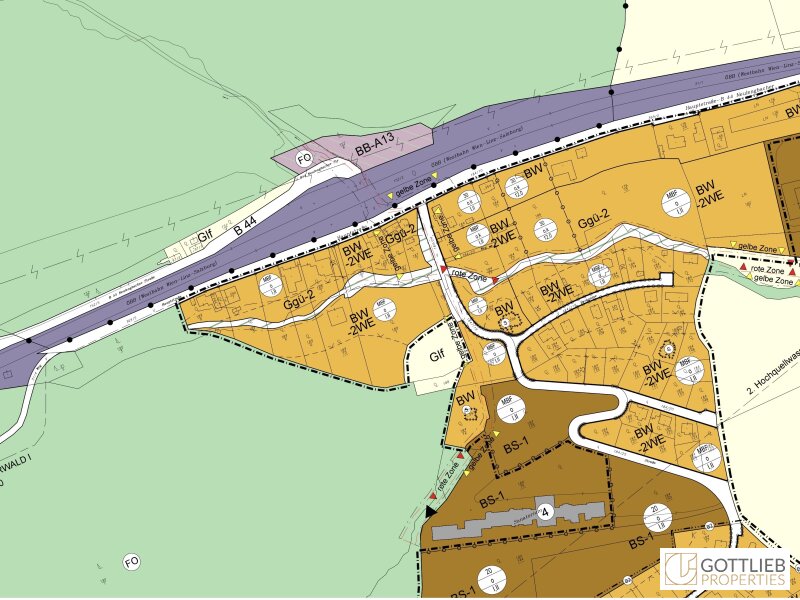 Das gesamte Grundstück ist mit einer BW-2WE Widmung belegt. Mindestausmaße, maximale Bauflächen, maximale Erschließungsservitute sowie zwei Stellplätze pro Wohneinheit werden von der Gemeinde Pressbaum vorgegeben. Weiters darf bis zu einer Bauplatzgröße von 1.000 m² ein Hauptgebäude mit zwei Wohneinheiten pro Bauplatz mit je zwei Stellplätzen errichtet werden.