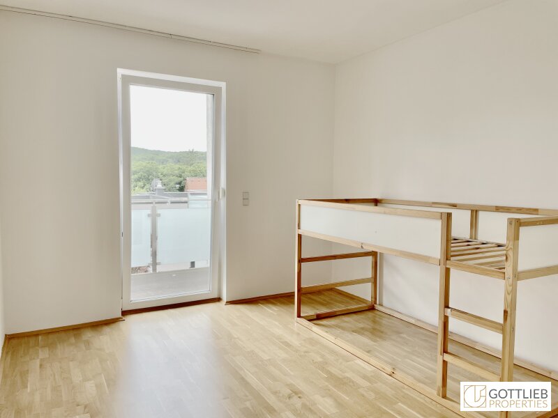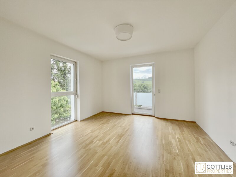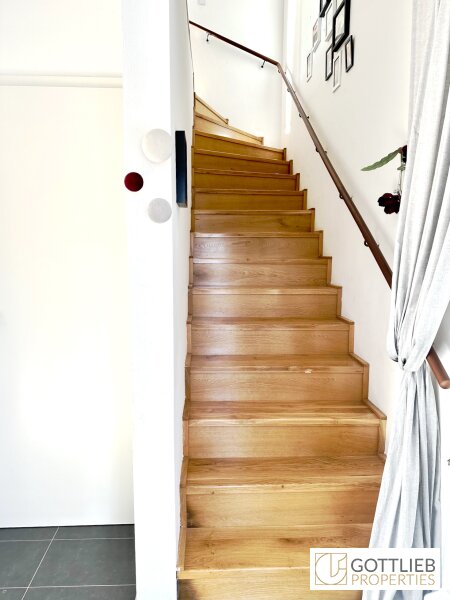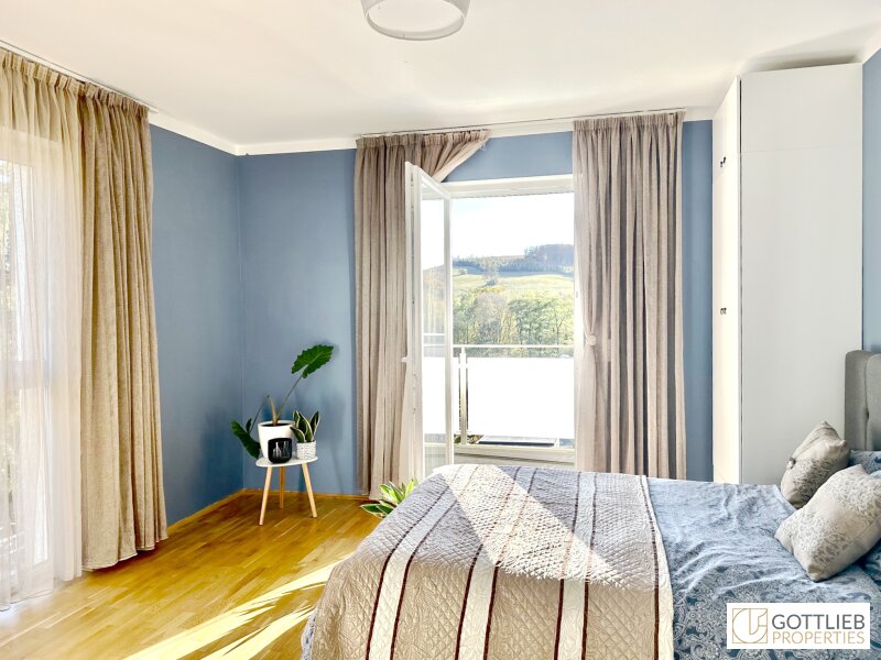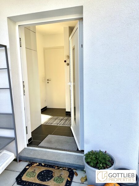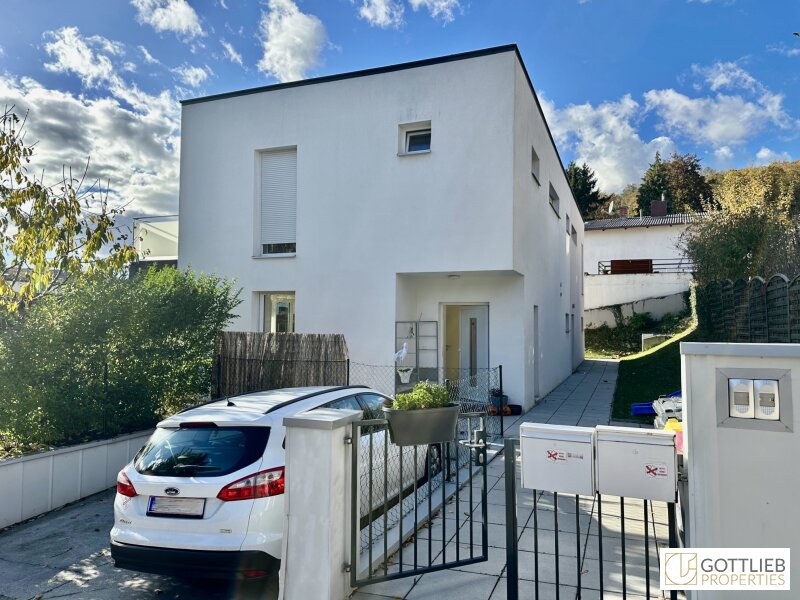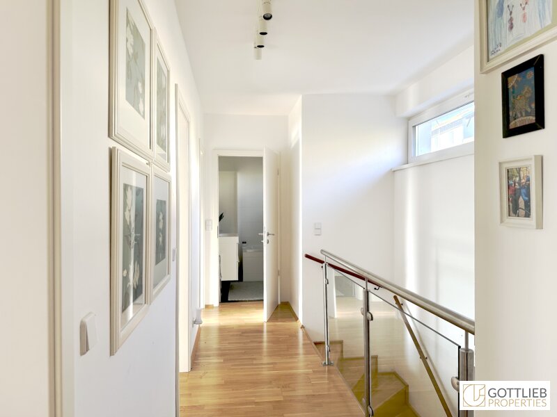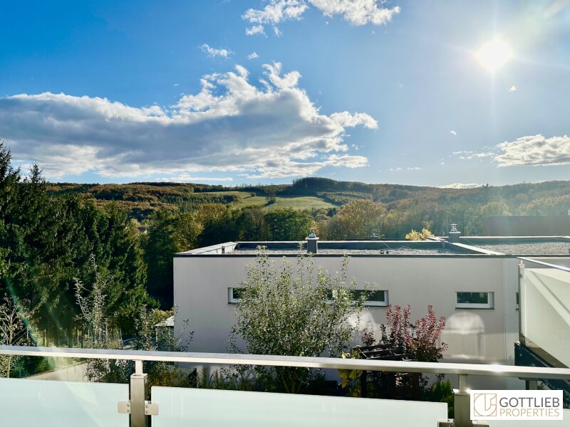 Vom Eingangsbereich erreicht man den geräumigen Wohn-Ess-Bereich mit ca. 37 m2, welcher Zugang zur Terrasse und zum Eigengarten bietet sowie eine Gäste-Toilette und einen Technik- und Abstellraum. Über eine Treppe im Vorraum gelangt man in das erste Obergeschoss mit drei Schlafzimmern, ein Tageslichtbad mit Badewanne und Dusche, eine Toilette sowie einen Abstellraum. Alle drei Schlafzimmer bieten separaten Zugang zu einem Balkon mit imposantem Fernblick, der sich über die gesamte Länge der Doppelhaushälfte erstreckt.