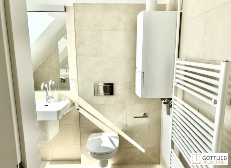 - Wannenbad mit Doppelwaschbecken, Handtuchwärmer, Toilette und Waschmaschinenanschluss