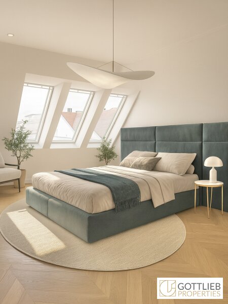 Über einen Gang erreicht man den Abstellraum, das Tageslichtbad mit Badewanne und Waschbecken, den nordseitig gelegenen Master-Bedroom mit ca. 18,00 m², das Bad – ausgestattet mit Dusche, Waschbecken und Toilette – sowie ein weiteres, südseitig ausgerichtetes Schlafzimmer mit ca. 16,00 m² und privatem Balkon.