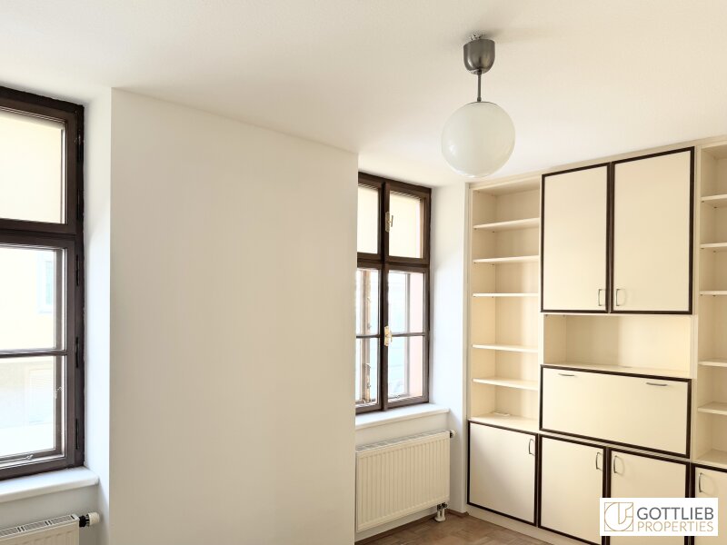 Weiters erreicht man direkt die einladende Küche mit Essplatz, ein Arbeitszimmer, welches auch als Gästezimmer genutzt werden kann, sowie das gemütliche Schlafzimmer. Diese Räume sind mit ausstellbaren Kastenfenstern im Stil des historischen Vorstadthauses ausgestattet.