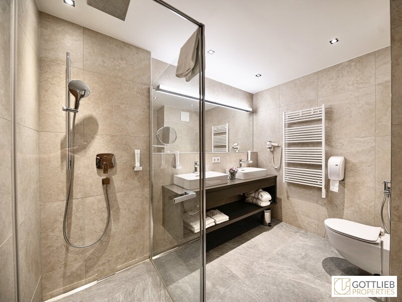 + angeschlossenes Duschbad mit Sauna, Doppelwaschbecken, Handtuchwärmer und Toilette