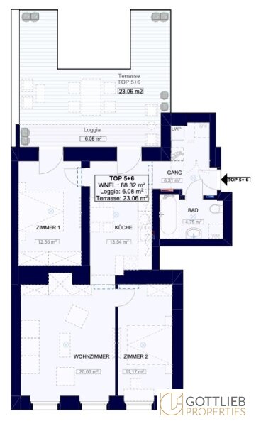 Über einen Vorraum gelangen Sie ins Badezimmer mit Badewanne und Toilette, in die geräumige Küche sowie ein Schlafzimmer. Diese Räume sind südseitig zum ruhig gelegenen Innenhof ausgerichtet und haben einen direkten Ausgang auf die ca. 6,00 m² große Loggia und die ca. 23,00 m² große Terrasse. Das Wohnzimmer mit ca. 20,00 m² und ein weiteres Schlafzimmer erreicht man über die Küche und komplettieren diese somit den Grundriss dieser sehr gut geschnittenen Altbauwohnung.