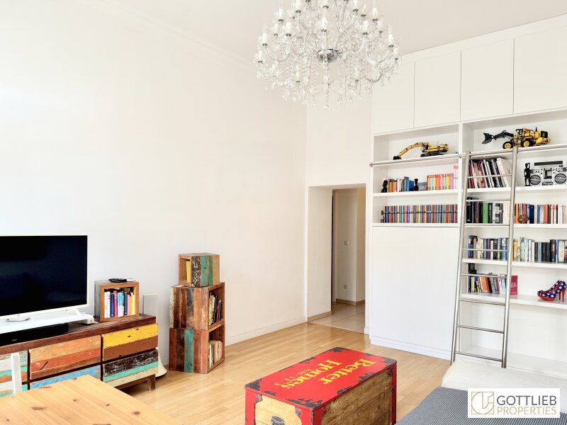 Man betritt die Wohnung über einen Vorraum, von dem aus alle Räume dieses Apartments zentral begehbar sind. Das großzügige Wohnzimmer mit ca. 21,00 m² sorgt mit seinen großen Fenstern für ein sonniges und lichtdurchflutetes Ambiente und unterstreicht den zeitlosen Altbau-Charakter dieser Wohnung. Hochwertige Möbel und stilvolle Details schaffen eine absolute Wohlfühl-Atmosphäre, die Wärme und Exklusivität verbindet.