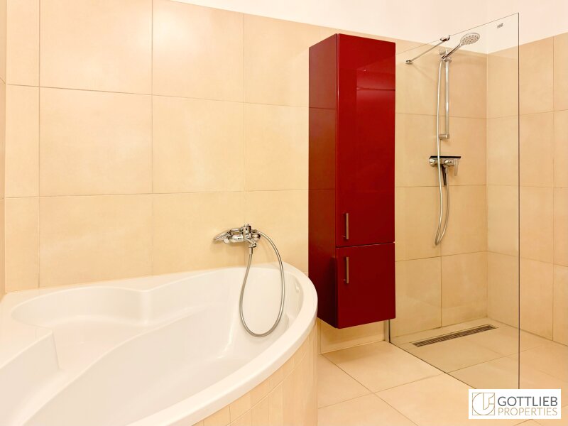 + modern ausgestattetes Badezimmer mit Badewanne, Dusche, Waschbecken sowie Handtuchwärmer