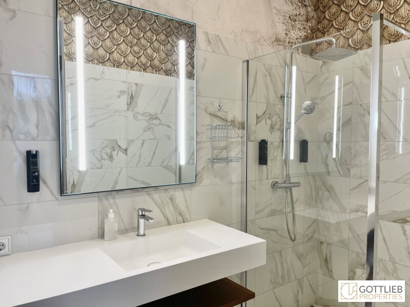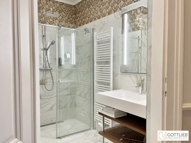 - Bad mit bodengleicher Dusche, Waschbecken und Handtuchwärmer