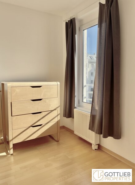 Die Wohnung liegt im fünften Liftstock und ist südwestseitig zum ruhigen, begrünten Innenhof ausgerichtet. Das Apartment wird möbliert vermietet. Die Küche ist mit neuer Geschirrspülmaschine, Kühlschrank, neuem Induktionsherd und einem Mini-Ofen versehen. Das großzügige Badezimmer ist mit Badewanne, Waschbecken mit Oberschrank, Waschmaschine und Toilette ausgestattet. Im Schlafzimmer befinden sich ein Doppelbett mit Nachttisch sowie eine Kommode.