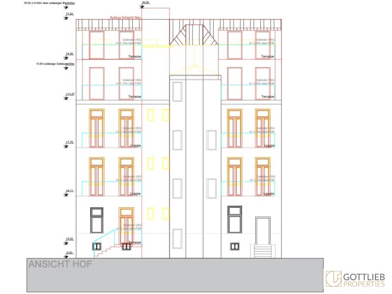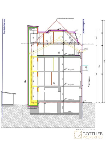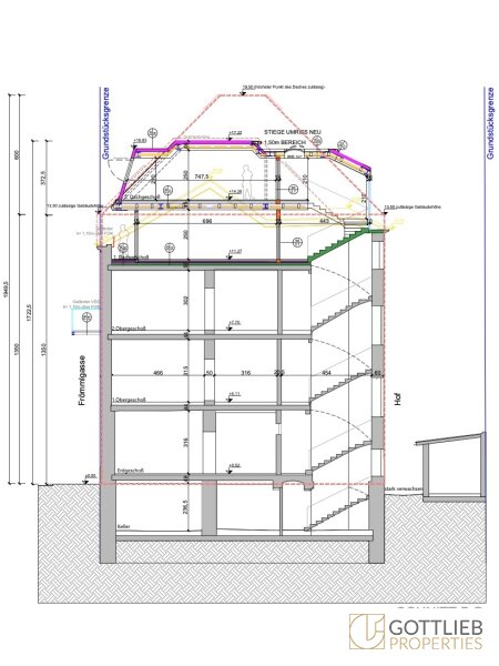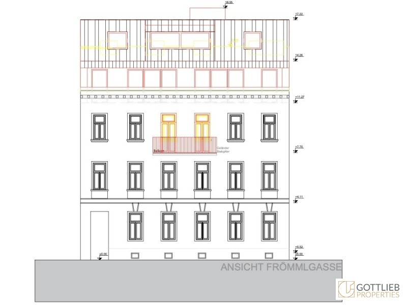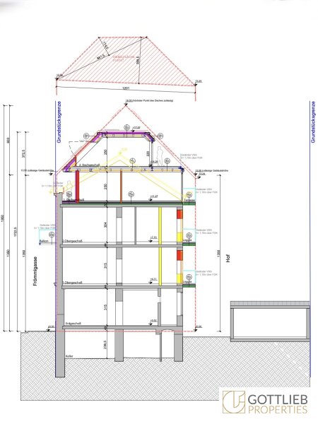 Eine Baugenehmigung zur Abtragung der bestehenden Dachkonstruktion und zum Ausbau des Dachgeschosses sieht eine Aufstockung um zwei Dachgeschosse vor, welche zusammen mit dem Altbestand insgesamt neun Wohneinheiten ermöglichen.