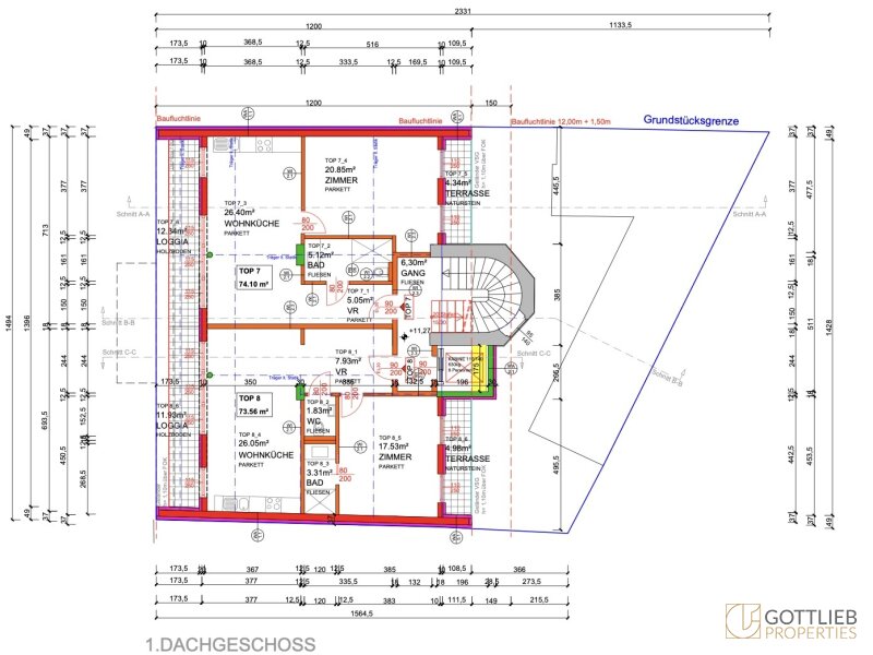 Durch den Um- und Ausbau ergibt sich eine projektierte Wohnnutzfläche von insgesamt ca. 611,59 m². Alle Wohnungen haben entweder Balkone oder Terrassen von insgesamt ca. 64,62 m², Loggien im Umfang von insgesamt ca. 18,64 m² oder einen Garten von insgesamt ca. 39,36 m².